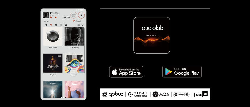 Audiolab 9000N-appen giver øjeblikkelig adgang til Qobuz og Tidal med fuld adgang til højopløsnings- og MQA-indhold samt Spotify, TuneIn internetradio og UPnP-musikserversystemer og digitale lydfiler gemt på USB HDD-enheder.